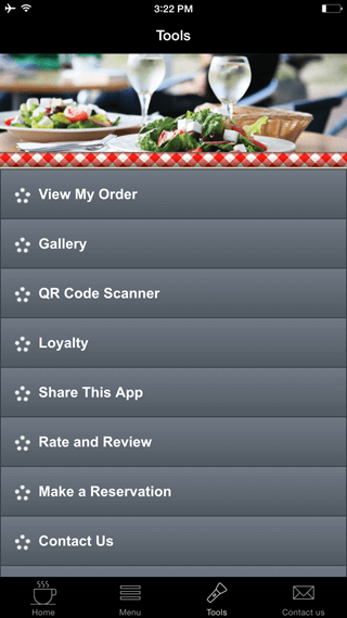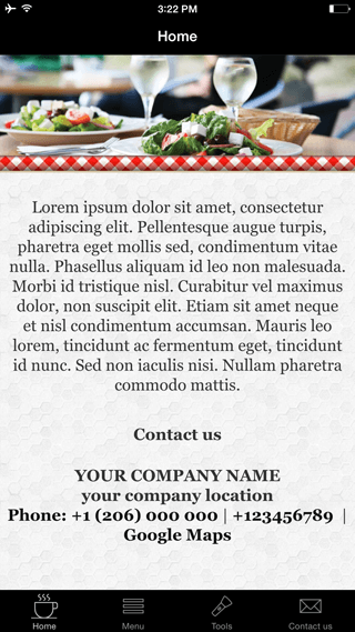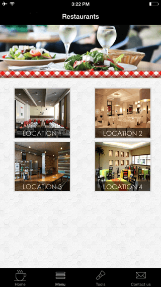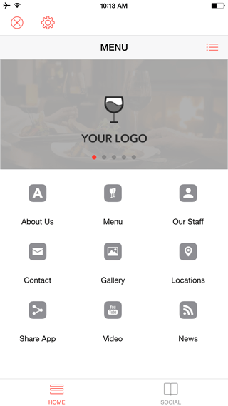 Your Restaurant's menu, picture galleries, dishes. Create an app for your clients to order directly from their phone device. Send happy hour Push Notifications. Auto-Push if device is in a radius area from your location. Use SOCIAL WALL menu to stay in touch with your customer using social networks.